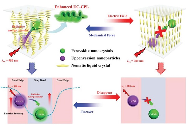 图一、CsPbBr3和UCNPs在手性向列相液晶中发生辐射能量转移过程的示意图
