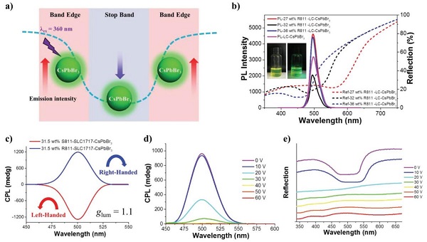 (b)N*LC的反射光谱和CsPbBr3纳米晶的发射光谱;