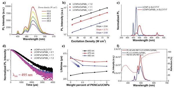 (a)CsPbBr3/UCNPs在液晶中的上转换发射光谱;