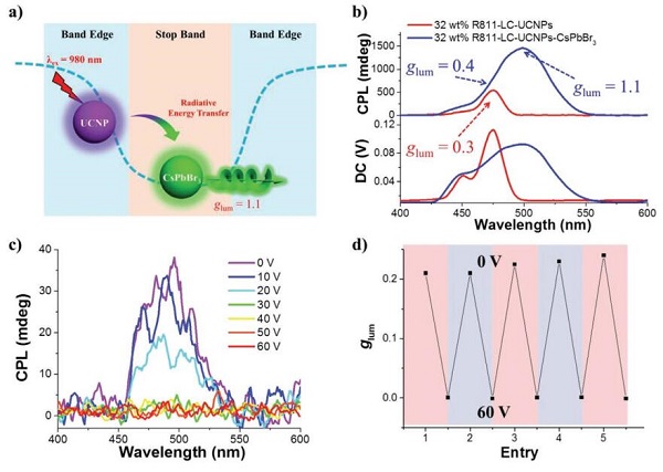 (d)电场和外力调控的上转换圆偏振发光开关。