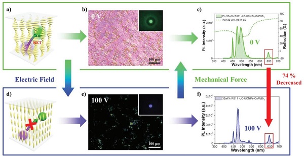 (a)0 V时,CsPbBr3纳米晶和UCNPs在手性液晶中发生能量转移的示意图;