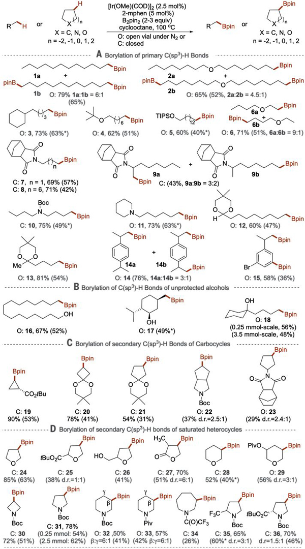 图2 烷基的一级C-H键和环状化合物的二级C-H键的硼化作用