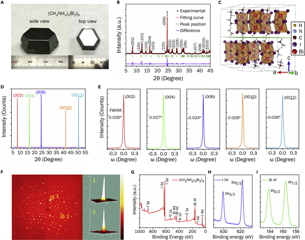(G-I)MA3Bi2I9 SC的XPS谱:(CH3NH3)3Bi2I9 (G)、I 3d(H)和Bi 4f(I)。