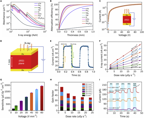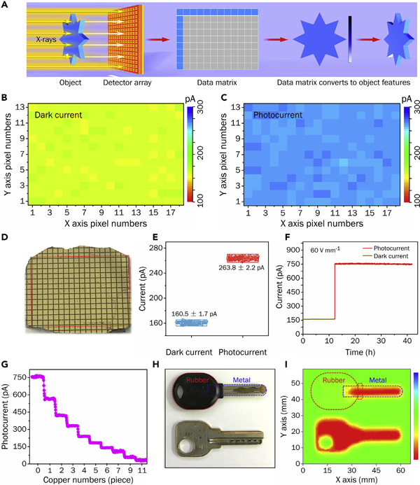 (B,C)18×13像素的MA3Bi2I9 SC X射线探测器阵列的暗电流(B)和光电流mapping(C)。X射线的剂量率为2.44 μGyair s-1,电场为60 V mm-1。