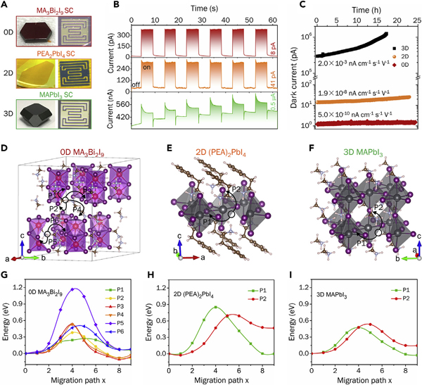(D-F)优化的0D MA3Bi2I9(D)、2D(PEA)2PbI4(E)和3D MAPbI3(F)钙钛矿的晶体结构,其中I−离子迁移路径用箭头标记为P1、P2、P3、P4、P5和P6。