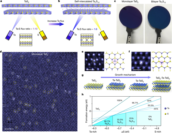a,b)分别显示了MBE在低Ta-flux和高Ta-flux环境下,原始TaS2(a)和自插层Ta7S12(b)的生长示意图。较低的Ta通量产生H相TaS2,而较高的Ta通量产生自嵌入相。