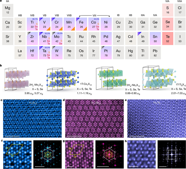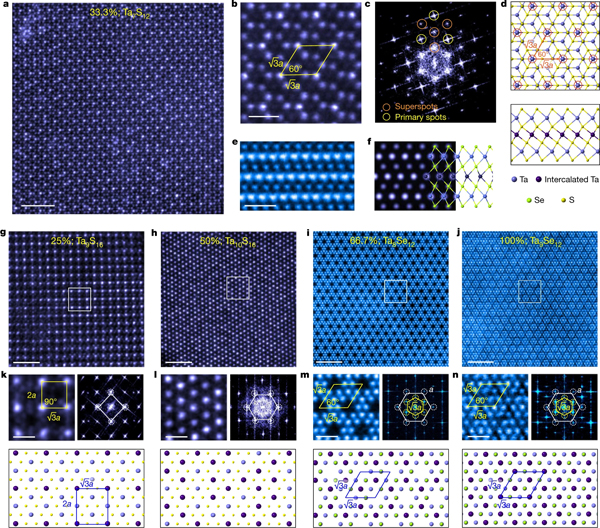 近日,在新加坡国立大学罗建平教授、Stephen J. Pennycook教授和中山大学罗鑫教授(共同通讯作者)的带领下,并与南方HTH官网地址 大学、丹麦技术大学、南洋理工大学和中国科学院大学展开合作,证明了在生长过程中,金属原子可以自插入到双层过渡金属硫族化合物中,产生了一类超薄共价材料,称之为ic-2D。这些材料的化学计量比是由范德瓦尔斯间隙的八面体空位的周期性占据模式来定义的,它们的性质可以通过改变插层量的覆盖率和空间排列来调整。通过在高金属化学势下进行生长,可以得到一系列钽嵌入的TaS(Se)y自插层化合物,包括25%Ta嵌入的Ta9S16、33.3%Ta嵌入的Ta7S12,50%Ta嵌入的Ta10S16,66.7%Ta嵌入的Ta8Se12(形成Kagome晶格)和100%Ta嵌入的Ta9Se12。在某些插入相中检测到铁磁序。此外,还证明了自嵌入的V11S16、In11Se16和FexTey可以在富金属的化学条件下生长。建立了一套自插层的新体系和方法,通过该方法生长一系列具有化学计量比的新型共价键结合的自插层2D晶体材料。相关成果以题为“Engineering covalently bonded 2D layered materials by self-intercalation”发表在了Nature。