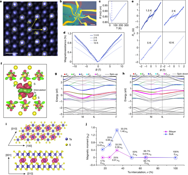 h)DFT计算插层浓度分别为25%、33.3%、50%、66.7%和100%的各种自插层TaxSy相的形成能随硫的化学势的变化。比例尺:d,2 nm; e,f,0.5nm。