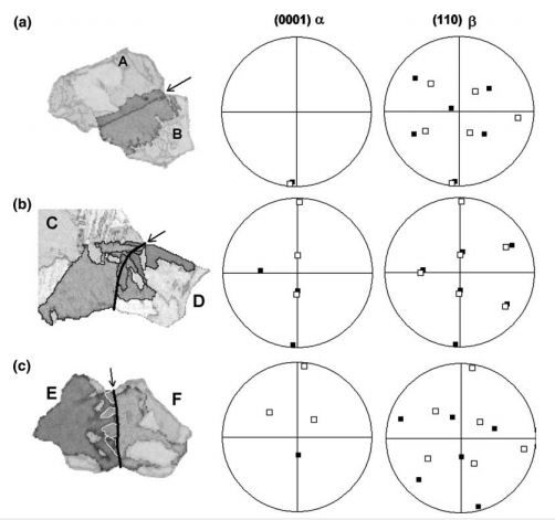 左边的 EBSD 衬度图展示了原始 β 晶粒,原始 β 晶粒的晶界如箭头所指,通过晶界的 α 变体被注明。 原始 β 晶粒的取向用右边的(110)极图表示。 在 β 晶界处形成的 α 变体的取向由中间的( 0001) 极图表示。 图中显示了三种不同的情况:(a)相邻 β 晶粒有共同的(110)极图;(b)相邻 β 晶粒有相近取向;(c)相邻 β 晶粒无相近晶体学取向[4]。