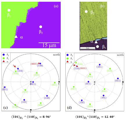 (a)和(b)分别为OIM(取向形貌)图,(c)和(d)分别为θm=8.96°和12.40°两种情形下,GBα的{0001}晶面与相邻两个原始β晶粒{110}晶面极图的重叠[7]。
