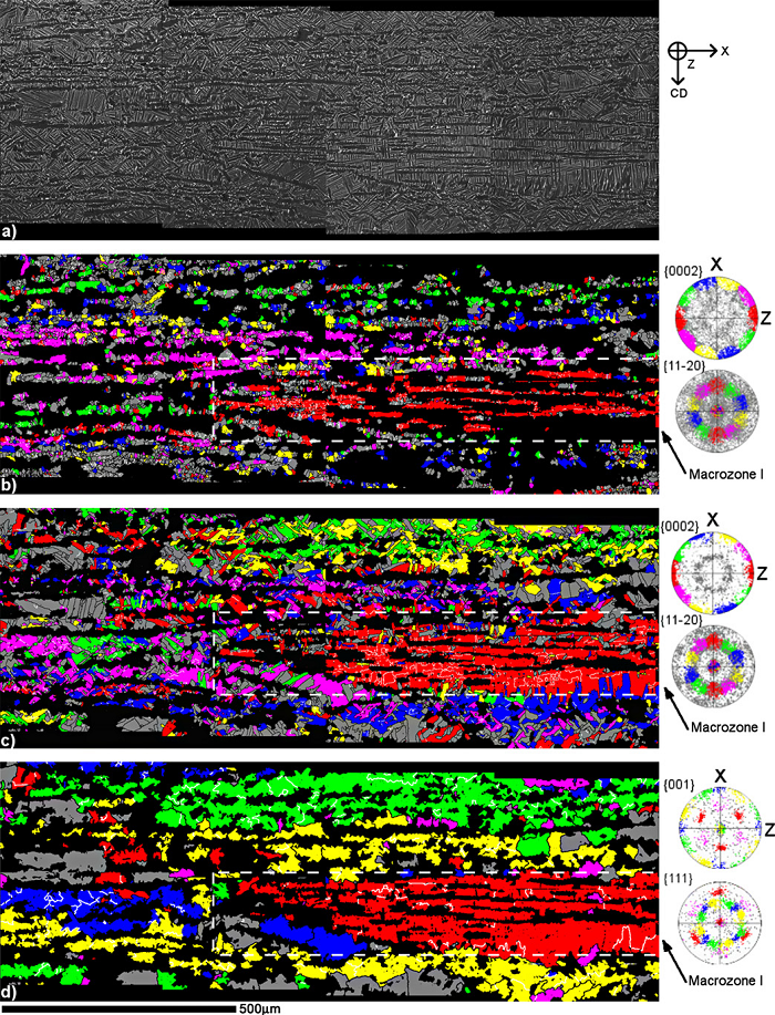 (a)背散射电子图片;(b)αp的取向形貌图和右侧对应的(0001)与(11-20)极图;(c)αs的取向形貌图和右侧对应的(0001)与(11-20)极图;d)重构原始β的取向形貌图和右侧对应的(001)与(111)极图[8]。