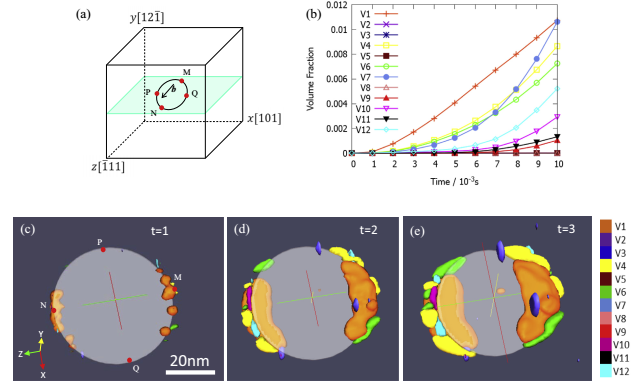 (a)位错环,滑移面为(12-1),=1/2[-111] ,M和N表示刃型位错,P和Q表示螺型位错;(b) 变体的体积分数,作为时间的函数;(c-e)组织演变规律[9]。