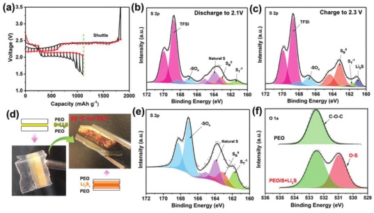 b-c)放电至2.1 V,充电至2.3 V时,PEO包覆的S/C电极的S 2p XPS谱图;