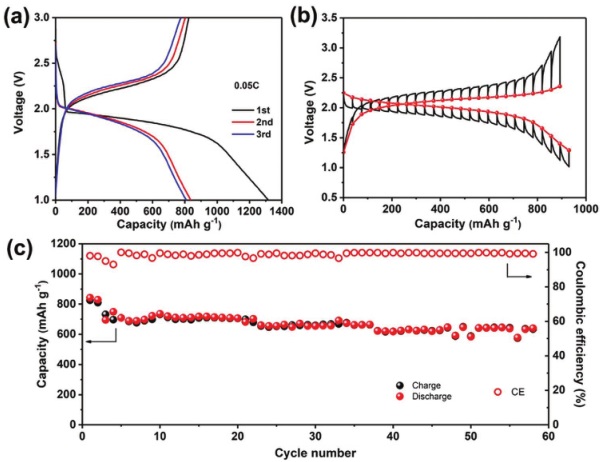 a) PVDF包覆的S/C电极在0.05 mA cm-2电流密度和55°C下的充放电曲线;