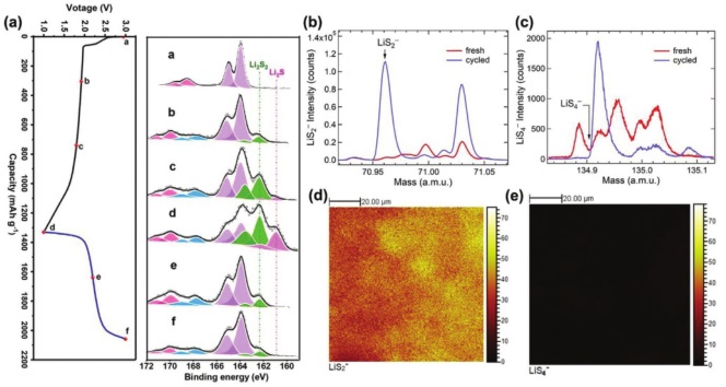 b-e)PVDF包覆的S/C负极在放电至1.85V时的TOF-SIMS光谱及其相应的LiS2–和LiS4–的高分辨率能谱。