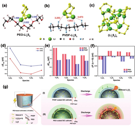 g) PVDF和PEO包覆的C/S电极在聚氧化乙烯基电解质中的作用机理示意图。