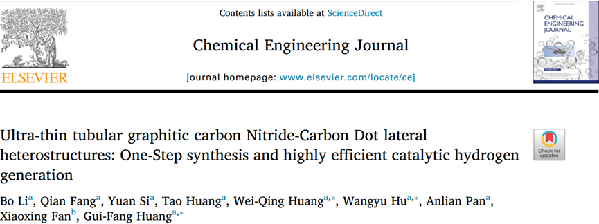 文章链接:Ultra-thin tubular graphitic carbon nitride-carbon dot lateral heterostructures: one-step synthesis and highly efcient catalytic hydrogen generation (Chemical Engineering Journal 397 (2020) 125470, https://doi.org/10.1016/j.cej.2020.125470)。