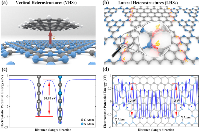 图1. CN/C-Dots的垂直异质结构 (VHSs)和横向异质结构 (LHSs)的原子结构和静电势。