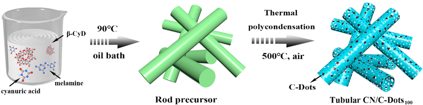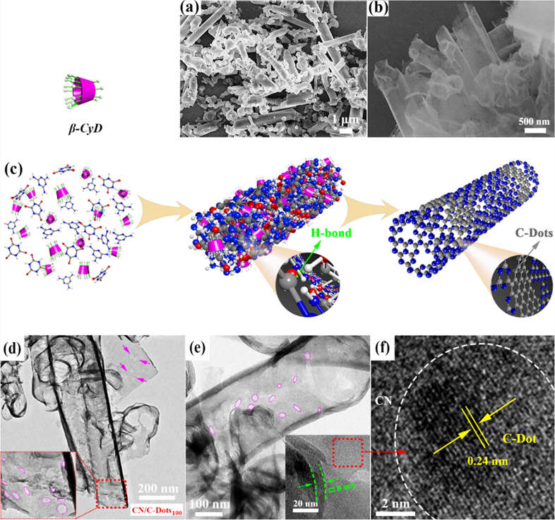 β-CyD不仅可以作为软模板调控形貌,还可作为碳前驱体形成C-Dots。采用分子协同自组装法制备棒状氢键超分子前体。退火后,通过释放NH3、CO2等各种气体,最终生成具有超薄多孔壁的管状CN/C-Dots LHSs。