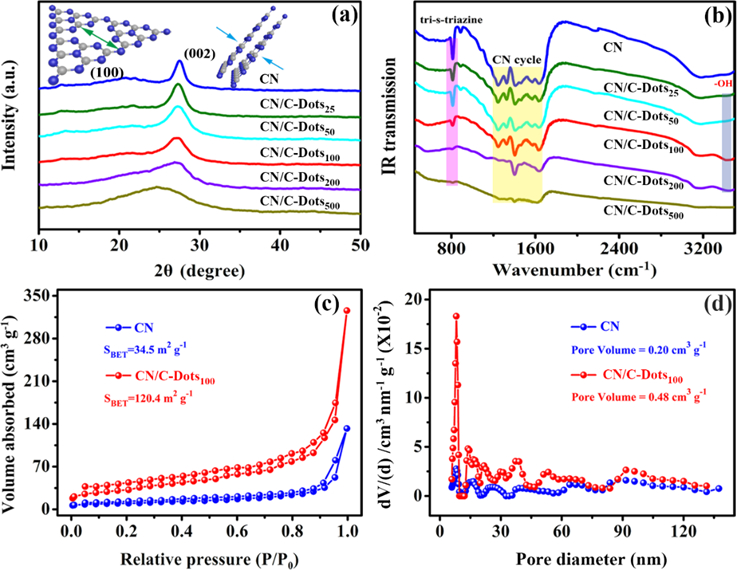 图4. CN和超薄多孔管状CN/C-Dots100 LHSs的晶体结构、化学结构和BET表征。