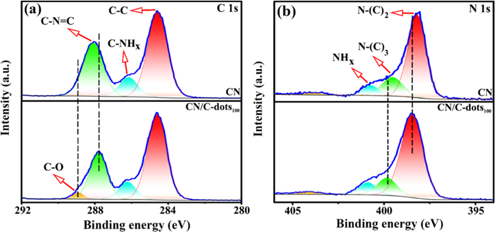 b) CN和CN/C-Dots100 LHSs N 1s XPS光谱。
