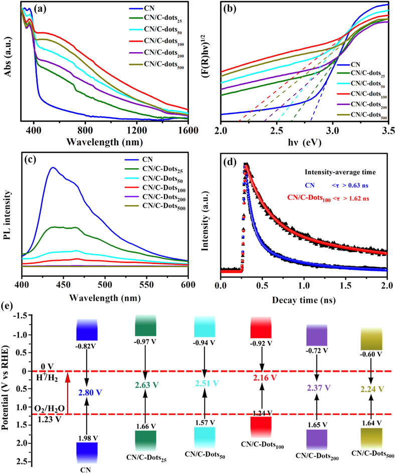 a) CN和CN/C-Dotsx的UV-vis DRS 光谱 (x = 25、50、100、200和500);
