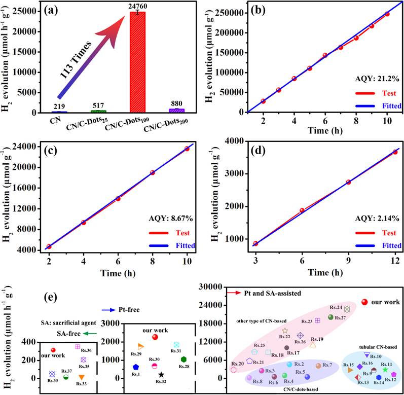 图7. CN和CN/C-Dots LHSs的光催化产氢性能测试。