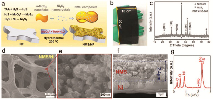 无定形纳米级MoSx(a-MoSx)具有丰富的活性位点和可扩展的合成能力,是用于氢释放反应(HER)的有吸引力的电催化剂。然而,阐明内部催化机理并以可扩展的尺寸实现更高的HER性能仍然是挑战。湖北大学王喜娜课题组与北京大学张艳锋课题组合作通过便携式水热法成功地在10×20 cm2大小的Ni泡沫上合成了由Ni3S2纳米晶体(尺寸<10 nm)装饰的a-MoSx薄片的杂化催化剂。通过结合状态和拉曼表征证明了[Mo3S13]2-簇与Ni3S2的强相互作用;[Mo3S13]2-簇本身与[Mo3S13]2-簇与Ni3S2之间的完美界面聚合作用通过密度泛函理论计算得到证实。这两个因素将氢的吸收能大大降低到几乎为零,从而大大提高了HER活性。在181和246 mV的过电势下分别达到100和600 mA cm-2的电流密度。这项工作为基于a-MoSx的催化剂的催化起源提供了基本的参考,并为非贵金属电催化剂与低成本批量生产的相容性提供了实际的应用。[10]相关成果以“Boosting the electrocatalytic activity of amorphous molybdenum sulfide nanoflakes via nickel sulfide decoration”为题,发表在Nanoscale。