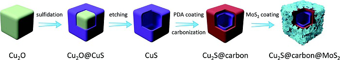 图二:三层Cu2S @ carbon @ MoS2分层纳米盒子合成示意图