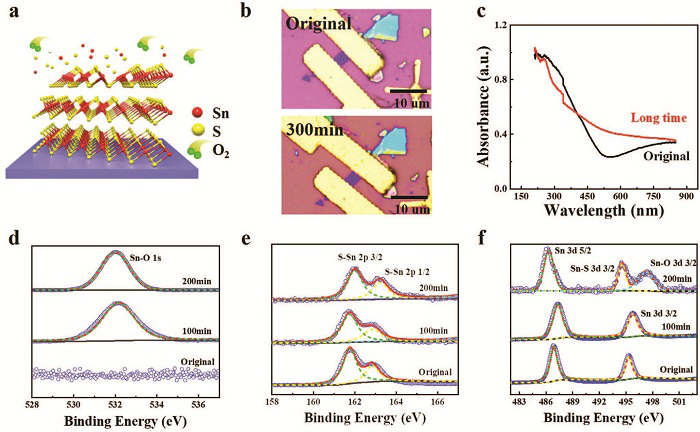 层状二硫化锡(SnS2)由于其高的载流子迁移率和出色的光响应性而成为具有多种功能的重要半导体,由于费米能级钉扎效应(显着的金属接触电阻)的固有缺陷Vs(硫空位),从而使其无法在光电器件应用中充分发挥其潜在的性能。华中HTH官网地址 大学翟天佑课题组报道了利用强O2等离子体处理来增强型SnS2基器件的光电性能,通过引入更多的载流子陷阱(缺陷)以增强其(光)载流子活性。通过实验研究和第一性原理计算,解释了处理过的SnS2能带结构变化的基本物理原理。在O2等离子体处理过程中,SnS2薄片的表面被蚀刻,同时注入了氧原子。在350 nm的光照下,经O2等离子体处理的SnS2光电探测器在385 AW-1至860 AW-1范围内表现出增强的光响应性,外部量子效率从1.3×105%到3.1×105%,比检测率从4.5×109 Jones到1.1×1010 Jones以及将上升(tr)和衰减(td)时间分别从12s和17s改进为0.7s和0.6 s的光开关响应。该研究为改善光响应和扩展响应光谱提供了新的思路,为光电子学的应用奠定了基础。[7]相关成果以“Giant-Enhanced SnS2 Photodetectors with Broadband Response through Oxygen Plasma Treatment”为题,发表在Adv. Funct. Mater.。