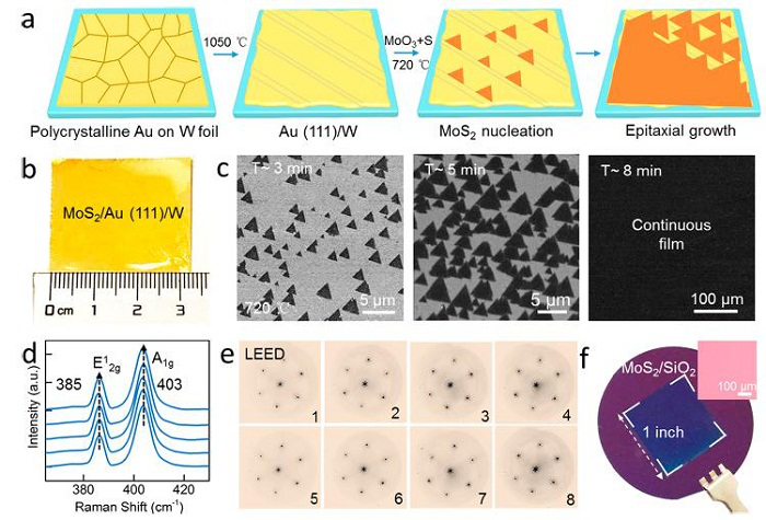 图八:在Au(111)上生长均匀单层MoS2单晶示意图及表征图