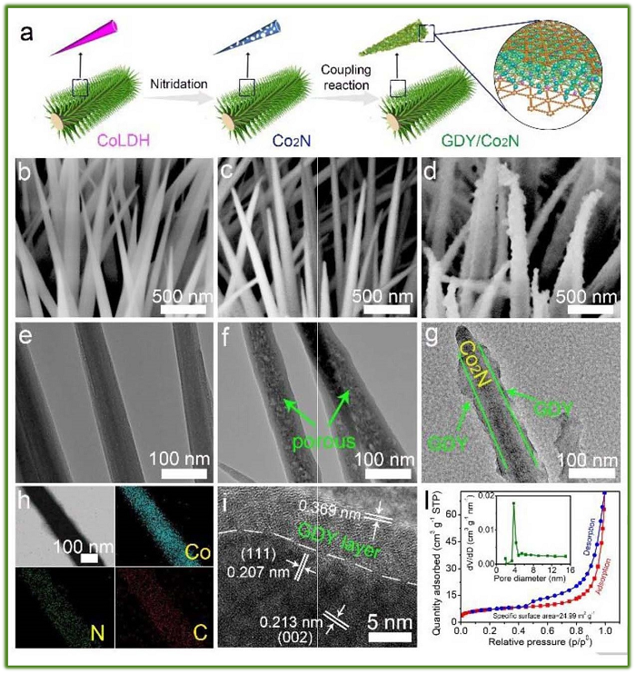 中科院化学所李玉良院士和香港理工大学的黄勃龙教授等人通过简便且可扩展的方法成功地合成了自支撑GDY/Co2N。它已被证明是ECNRR的有前途的催化剂,具有100%的选择性,高的氨收率和法拉第效率。研究结果表明,界面区域的GDY层在促进电子向N2的转移方面起着重要作用。同时,GDY层独特地修饰了Co2N表面状态以充当电子泵浦中心,这驱动了界面Co位有效地将电子从Co2N转移到GDY层。GDY的引入可以产生更多的活性位点,促进金属与GDY之间的电荷转移,有利于提高ECNRR性能。整个界面对N2固定显示出重要的p-d耦合,显示了催化活性和电子活性之间的正相关。这种相互作用提示了一种创新的策略和改进基于电化学的N还原性能的途径。最终,这种新的基于石墨二炔的电催化剂研究带来新思路。