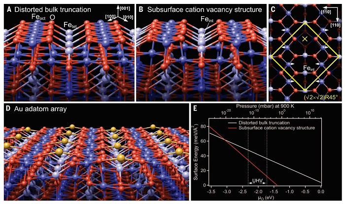 近年来,铁氧化物在越来越多的领域扮演着愈发重要的角色,包括多相催化、产氢反应、自旋电子学以及药物传输等。但是,铁氧化物材料的表面或相界面对这些应用而言具有一定的阻碍作用,因此,从原子尺度的层面上来确定铁氧化物材料的结构并且理解其形成原因对于推动铁氧化物的应用具有十分重大的意义。维也纳理工大学的G. S. Parkinson教授课题组采用了定量低能电子衍射,扫描隧道显微镜和密度泛函理论相结合的研究方法,证明了一层次表面的铁原子空位和间隙阵列可以形成众所周知的(√2x√2)R45°重构的Fe3O4(001)晶面,这一稳定的转变机制是前人尚未观察到的。其产生原因是,铁氧化物在氧化或还原性环境中倾向于在晶格中重新分配阳离子从而形成这种表面结构。值得注意的是,一些其他的金属氧化物也倾向于以这种方式实现化学计量的变化,这也反映出了这种表面结构其实是很常见的。相关研究以“Subsurface cation vacancy stabilization of the magnetite (001) surface”为题发表在Science上[1]。