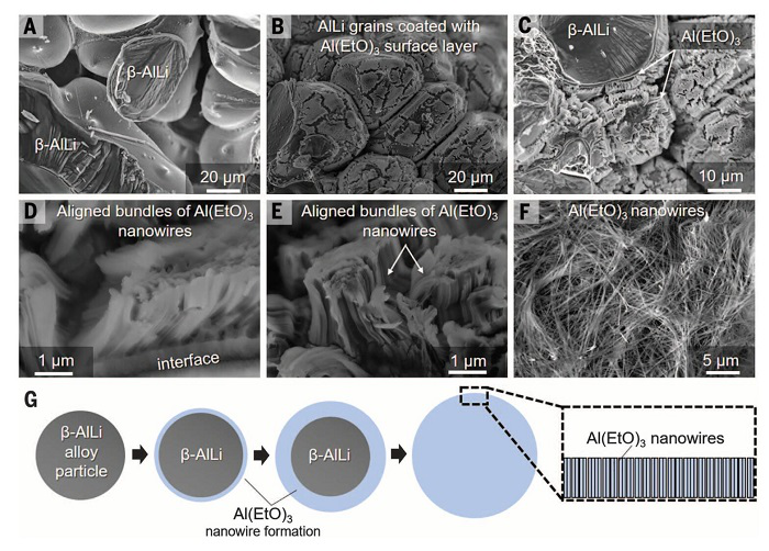 一维纳米材料,作为一种在一定方向具有取向特性的材料,是目前人们认为的最理想的电子传输材料,可被作为电子及光激子有效传输的最小维度的材料,其目前主要应用场景有场效应晶体管、共振隧道二极管等纳米电子器件。此外,其独特的一维结构也使其在陶瓷增韧、微机电系统等领域发挥着独特的作用[4]。但是目前的一维材料合成方法往往是非常复杂而昂贵的,这在很大程度上阻碍了一维材料在许多领域的应用和发展。就此,佐治亚理工学院的Gleb Yushin教授课题组提出了一种新的一维材料制备方法,他们证明了可以在无催化剂或任何外部刺激的条件下将块体的微米级的金属铝颗粒直接转变为铝醇盐纳米线,并且通过在空气中煅烧的方法可以直接将铝醇盐纳米线进一步转变为氧化铝纳米线。通过利用基于该氧化铝纳米线所制备得的分选装置,可以极大地提升锂离子电池的安全性和充放电速率。该方法的报导,成功实现了在极低的成本下完成一维材料或薄膜的制备,对一维材料的广泛应用具有深远意义。相关的研究成果以“Transformation of bulk alloys to oxide nanowires”为题发表在Science上[5]。