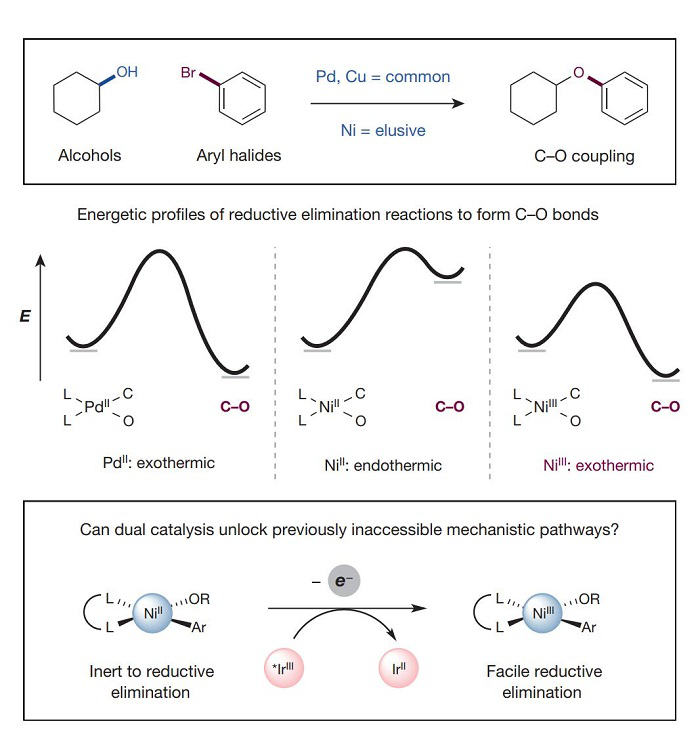 过渡金属催化的交叉偶联反应已成为化学合成中最常用的“碳-碳”和“碳-异质原子”成键反应之一。近年来,镍催化剂已经被证明参与了各种各样的“碳-碳”键形成反应,其中最著名的包括Negishi, Suzuki–Miyaura, Stille, Kumada 和Hiyama偶联反应。尽管利用片段偶联的方式来生成“碳-碳”键的方法已经取得了巨大的进展,但通过镍的催化作用以一般的方式生成“碳-氧”键的成效却大大相反。因此,镍介导的醇耦合挑战已经成为交叉偶联反应过程中“碳-氧”键的形成这个关键步骤得以通过镍(III)烷基中间体来产生的原理性需求。就此,普林斯顿大学David W. C. MacMillan教授的课题组证明了可见光激发的光氧化还原催化剂可以在催化循环中调节镍醇氧化合物的优先氧化态,从而为易参与还原消除的Ni(III)提供短暂的通道。基于这种光氧化还原和镍催化的协同结合效应,他们使用丰富的醇和芳香基溴化物开发了一种高效和通用的碳氧耦合反应。这也成为一种通用的策略,通过仅使用弱光和单电子转移催化剂的氧化态调制来“开启”重要而又难以捉摸的有机金属机制。相关研究成果以“Switching on elusive organometallic mechanisms with photoredox catalysis”为题发表在Nature上[6]。