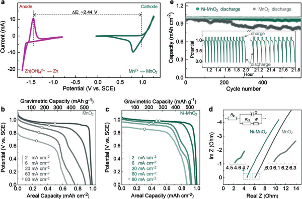 d)在完全充电状态下电沉积的Ni-MnO2和MnO2正极的EIS。 Rb(Q(RctW))的等效电路(见插图)用于模拟电阻,其中Rb、Rct、Q和W分别代表溶液和电极的欧姆电阻、电荷传递电阻、双层电容和Warburg阻抗。