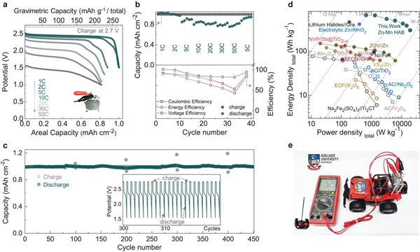 e)带有两个串联的单节电池的Zn-Mn HAB电池组的数码照片,显示开路电压为5.25 V,可用于为车辆模型供电。