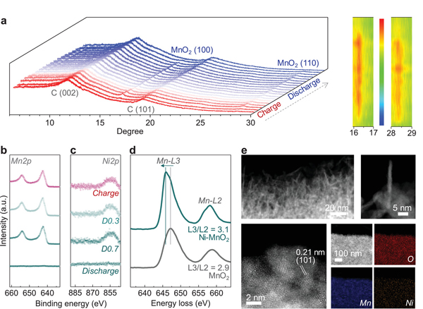 a)从裸碳毡的初始状态开始,间隔30 s的高分辨率原位同步加速器XRPD图形。 右侧是Ni-MnO2电氧化/电还原过程中(100)和(110)面的等值线图。