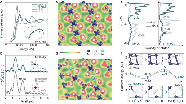 近日,在澳大利亚阿德莱德大学乔世璋教授团队等人(通讯作者)带领下,晁栋梁研究员(第一作者)与中国科学院物理研究所、澳大利亚同步辐射中心合作,构造了一种高倍率高电压锌锰混合水系电池(HAB),其电化学稳定性窗口超过3.4 V,且成本低廉。继2019年4月乔世璋教授课题组报道“第一代2.0 V电解锌锰电池”体系(Angew. Chem. Int. Ed., 2019, 58, 7823-7828)后,引入选择性离子膜后进一步提高水系电池电压。同时为了克服含膜电池的动力学瓶颈,本文通过简单地在电解液中加入Ni2+,引入催化的MnO2/Mn2+电解动力学。本文采用了多种技术,包括原位同步辐射X射线粉末衍射、原位X射线吸收精细结构和电子能量损失光谱,揭示了电荷存储机制和倍率性能提高的起源。密度泛函理论(DFT)计算揭示了引入强电负性Ni后,增强了活性电子态。反应途径的模拟证实了电解动力学的增强,及Ni掺杂物周围的活性O位点的电荷转移的促进。这些研究结果或可显著推动高电压含膜水系电池向高功率低成本的实际应用迈进了一步。该成果以题为“Atomic Engineering Catalyzed MnO2 Electrolysis Kinetics for a Hybrid Aqueous Battery with High Power and Energy Density”发表在了Adv. Mater.上。