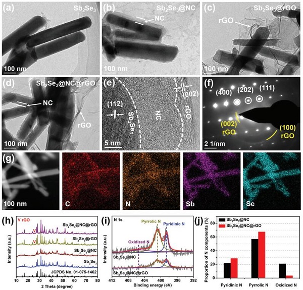 (a-d)裸露的Sb2Se3纳米棒、Sb2Se3@NC、Sb2Se3@rGO和Sb2Se3@NC@rGO的TEM图像;