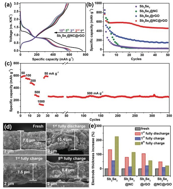 (e)在充放电周期中,Sb2Se3、Sb2Se3@NC、Sb2Se3@rGO和Sb2Se3@NC@rGO电极的电极厚度增加量。
