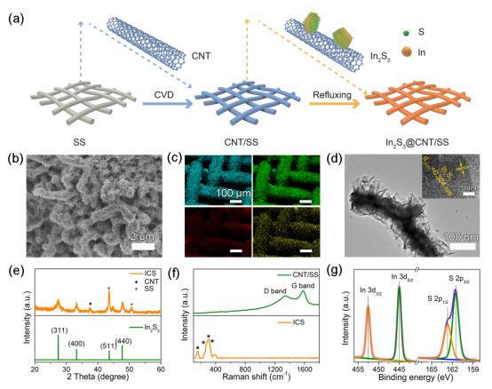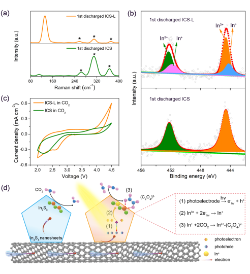 近日,吉林大学的徐吉静教授(通讯作者)等人巧妙地设计和制备了分级多孔的In2S3@CNT/SS(ICS)双功能光正极,并构建了新型的光辅助Li-CO2电池体系。在模拟太阳光照射下,ICS受光激发产生电子和空穴,表现出优异的CO2还原与析出催化活性。以ICS为正极的光辅助Li-CO2电池,展现了超高放电电压3.14 V(超过热力学极限)和创纪录的98.1%的往返效率。作者首次提出了通过光照下In3+还原成In+来预活化二氧化碳的放电反应机制。受益于ICS的柔性,将光辅助Li-CO2电池从扣式拓展到柔性电池,在便携性电子设备方面也展示出了广阔的应用前景。该成果以题为“Light/Electricity Energy Conversion and Storage for Hierarchical Porous In2S3@CNT/SS Cathode towards a Flexible Li-CO2 Battery”发表在Angew. Chem. Int. Ed.上。本文的第一作者为管德慧和王晓雪。