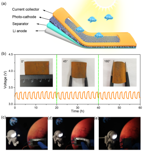 (c-e) 光辅助Li-CO2电池在0°,45°和180°的弯曲角度下点亮宇航员模型LED灯。
