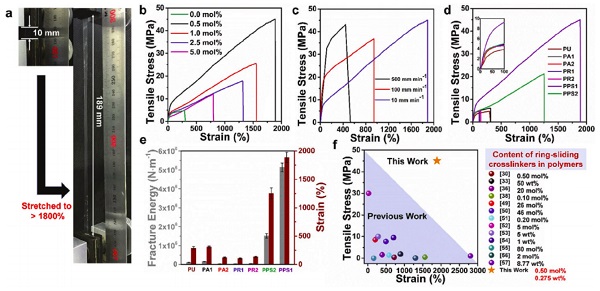 f)这个工作与先前关于超分子环滑动弹性体的工作的应力-应变比较图