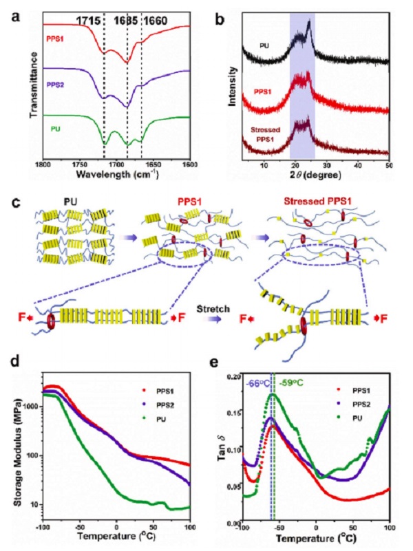 b,c)PU,PPS1和受力PPS1的XRD光谱和结构图