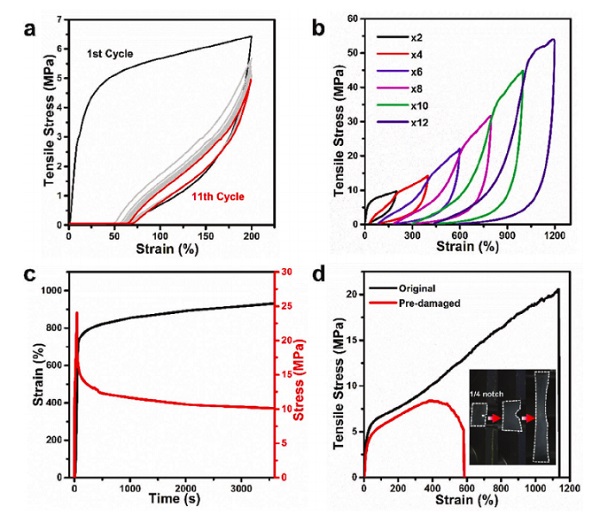 高性能聚合物弹性体备受关注,因为它们在诸如柔性电子,软机器人和响应性材料等新兴领域中具有广阔的应用前景。弹性体的机械性能决定了其工业适用性和前景。已经采用了许多方法来提高弹性体的性能,例如掺入纳米填料,多重互穿网络,动态共价键和非共价键(包括氢键,金属配位,疏水相互作用以及主客体相互作用)。然而,在提高机械强度和增加聚合物网络的可拉伸性之间总是存在折衷。因此,存在的挑战是通过引入最少量的外部添加剂来实质性地同时改善这些性能。