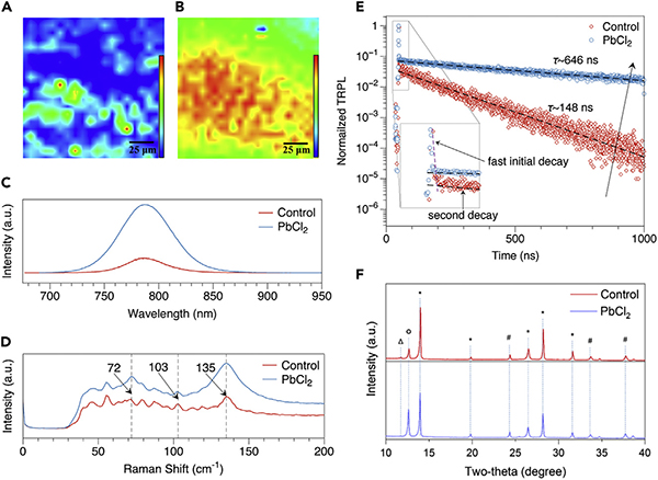 (A, B)对照组和经PbCl2钝化后的钙钛矿薄膜的高分辨率μ-PL图像;