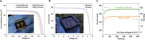 (C) 钙钛矿太阳能电池组件稳态光电流和效率。