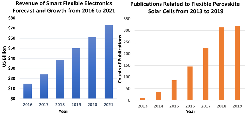 图一:柔性智能设备的市场发展和柔性钙钛矿电池的成果走势