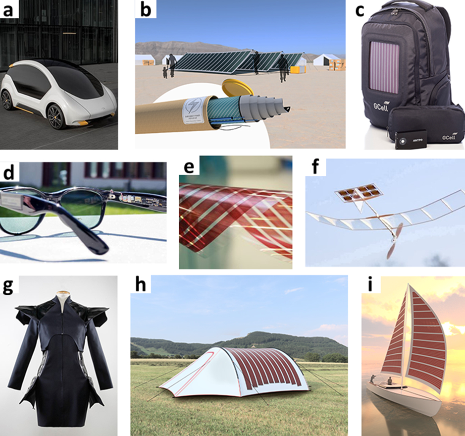 a) 太阳能电动汽车;b) 等待安装的发电网;c) 太阳能背包;d) 智能眼镜; e) 柔性钙钛矿电池; f) 无人机; g) 智能外套; h) 野外帐篷; i) 为帆船提供动力。